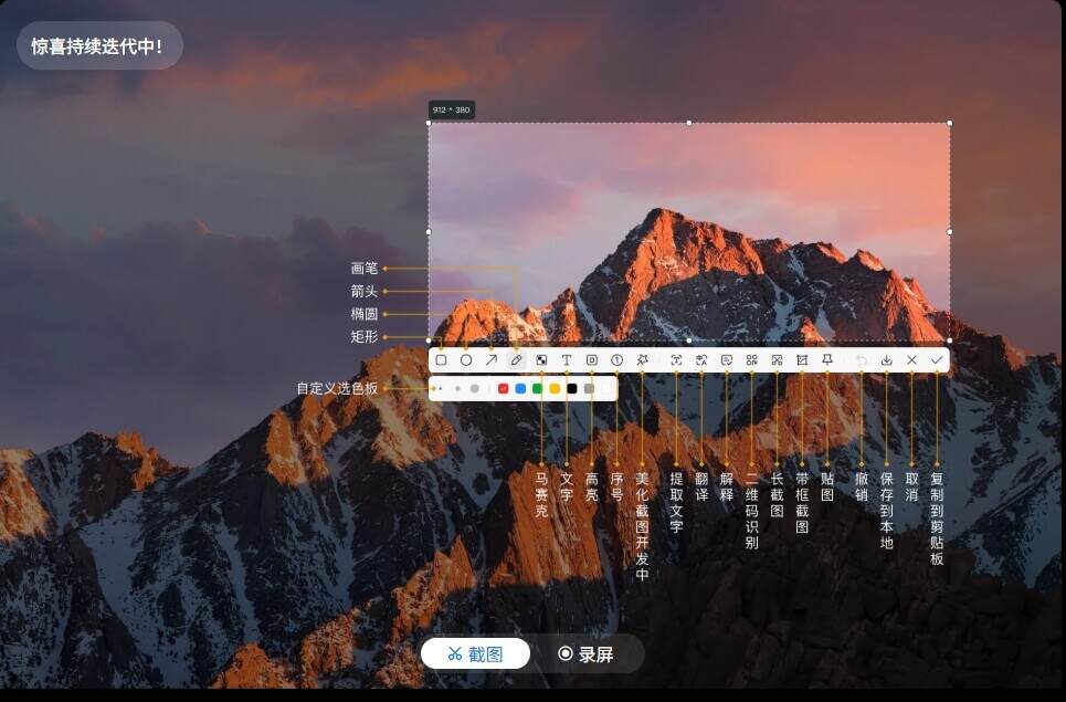 这款工具由国内团队开发,目前已经迭代多个版本,最新版本新增了全屏录屏和区域录屏功能,使其从单纯的截图工具进化为集截图、录屏、AI解析于一体的全能效率助手。