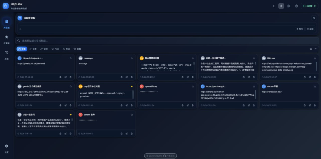 ClipLink ——跨平台剪贴板同步工具 在线工具 2025-06-17 一款强大的跨平台剪贴板同步工具,允许用户通过自托管的网页界面,在电脑与手机等不同设备间无缝共享剪贴板内容。 在大多数现代浏览器上,该工具可自动读取剪贴板;对于iOS等有安全限制的平台,也支持手动粘贴。所有内容历史都将保存在您自己的服务器上,通过网络实时同步,不经过任何第三方云服务,确保了数据的安全与私密。为保证功能正常,请务必通过HTTPS协议访问。 网址:https://cliplink.mmmss.com/ 剪贴板 工具 收藏夹 上一篇 创业大全——专为大学生双创赛事提供海量资源 下一篇 Zoom Earth 全球气象卫星聚合平台 延伸阅读: 热度 时效 暂无内容!