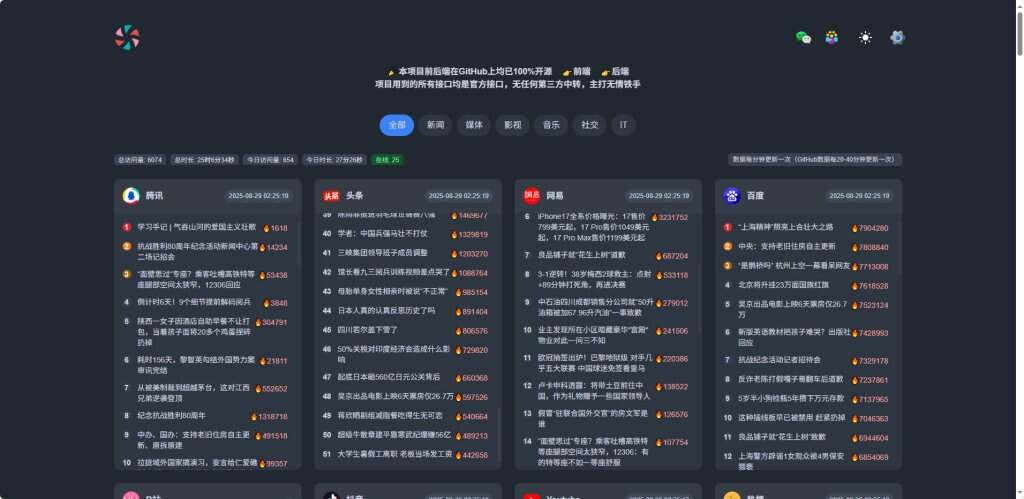 开源热榜站——聚合资讯页,新闻,影视,音乐,设计,数码。 互联网 2025-08-30 一个前后端开源的聚合资讯页,新闻,影视,音乐,设计,数码。 需要的也可以自己改造,部署。 网址:https://trend.tgmeng.com/ 互联网 资讯 上一篇 追剧狂人——免费在线影视资源网站 下一篇 苏州图书馆 · 古籍数据库 延伸阅读: 热度 时效 暂无内容!