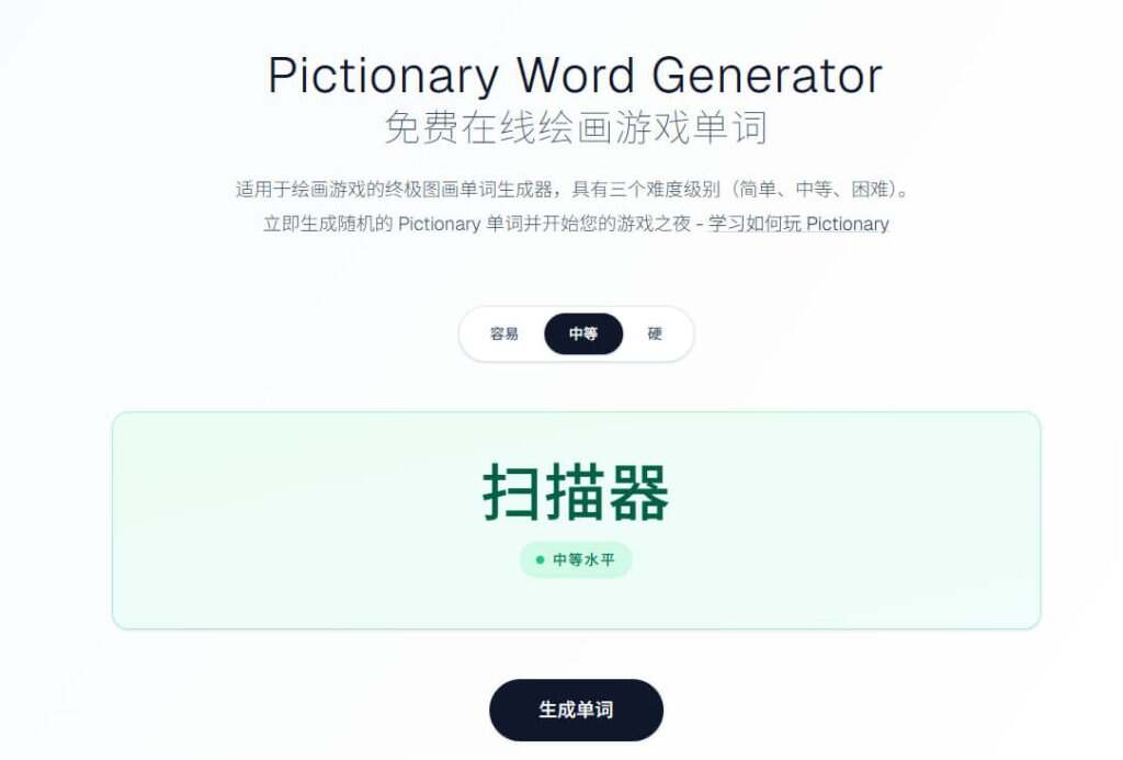 省去前期准备,增加了随机偶然性,好用的工具!网站可以在线实时生成你画我猜题目词语,配合协作画板就可以与朋友在线玩了!