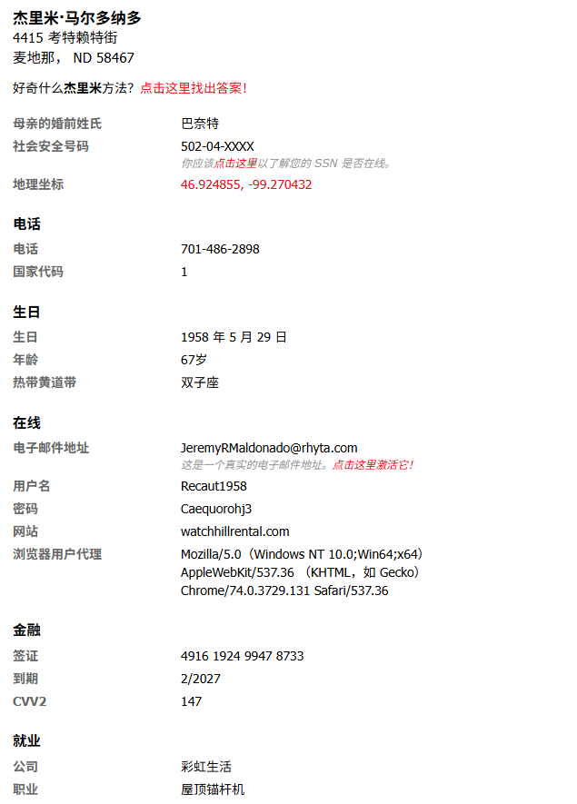 在线虚假身份生成器(Fake Name Generator),用户可以通过该网站随机生成包括姓名、住址、生日、社会安全号(SSN)、电子邮件、职业、财务信息等在内的全球各国个人身份资料。