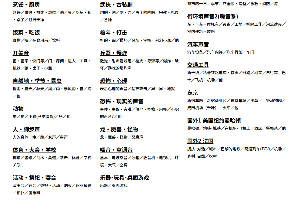 小森平音效 – 免费下载各种音效 素材资源 2025-11-21 网站所有的免费音效可用于你想用的项目,如电影、短片、游戏、发表、动画、舞台表演、广播剧、有声书、软体。音效的种类有:放/举家用设备烹饪/厨房饭菜/吃饭开关自然地/季节动物人/脚步声活动学校/体育乐器/玩游戏/按钮游戏/动画片魔术/幻想SF/机器人武侠/剑打击/攻击兵器/爆炸恐怖/心理恐怖/现实的声音怪物/龙街的声音1/日常街的声音2/噪音汽车车辆/交通工具噪音/空调东京海外/美国海外/法国街道 等数十种。 点击一个种类,进入音效播放页面,点击左边的目录就可以更换种类。 网址:https://taira-komori.net/us01cn.html 素材 音效 上一篇 BYRUTOR – 俄罗斯最大游戏破解资源站 下一篇 Userscript.Zone油候脚本/用户脚本搜索和在线安装 延伸阅读: 热度 时效 暂无内容!