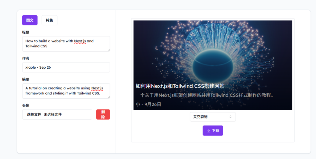 Cover Paint开源在线封面生成器 在线工具 2025-12-01 Cover Paint是一款开源在线封面生成器,支持自定义标题、作者信息、摘要、作者头像、封面背景照片等等信息,非常简单实用。 几秒钟内创建封面图片非常简单 网址:https://coverpaint.yanglele.cc/ 在线工具 上一篇 PicProse – 开源的封面图片制作工具 下一篇 ScreenDump截取网站在不同分辨率下的显示效果 延伸阅读: 热度 时效 暂无内容!