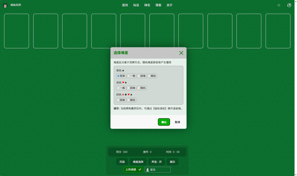 蜘蛛纸牌 – 免费在线玩 Spider Solitaire 轻松小游戏 2025-12-26 如果你只是想要一个“打开就能玩、不卡顿、没广告”的蜘蛛纸牌网站,这个真的可以。它没有花里胡哨的东西,但该有的功能都有。推荐给不想折腾、就想安静打牌的人! 🃏😊 操作顺手:拖拽、撤销、提示这些功能都有,而且响应很快,不像某些网页版纸牌动不动卡顿。 难度选择:有1种花色、2种花色、4种花色(经典难度),新手可以从简单的开始练手,老玩家也能挑战高难度。 自动收牌:这个功能太实用了!有时候牌型太散,手动理牌太麻烦,自动收牌能省不少事儿。 有玩法教程,还有全部玩家的排名。 网址:https://zh.spidersolitaire.cn/ 在线游戏 小游戏 上一篇 TuneTank – 在线音色与样本库平台 下一篇 Save Editor Online游戏存档修改 – Take control of your game! 延伸阅读: 热度 时效 轻松小游戏 请画一个小人一个趣味互动小游戏,首次需要你在网站内画一个小人,随便画一个人的形状就好,画完之后点击完成,然后小人就会动起来了。 接下... SD分享 2023-05-07 轻松小游戏 Super Mario Game 经典马里奥游戏在线玩在线重温经典马里奥游戏,无需下载 ROM 或模拟器,只需要打开网页即可畅玩 NES 版经典马里奥风格关卡,包含官方关卡与... SD分享 2025-07-21